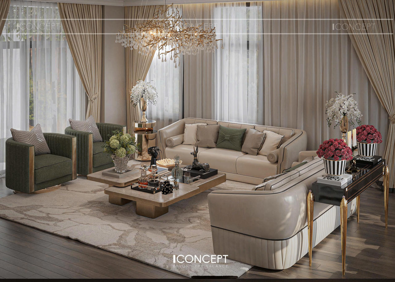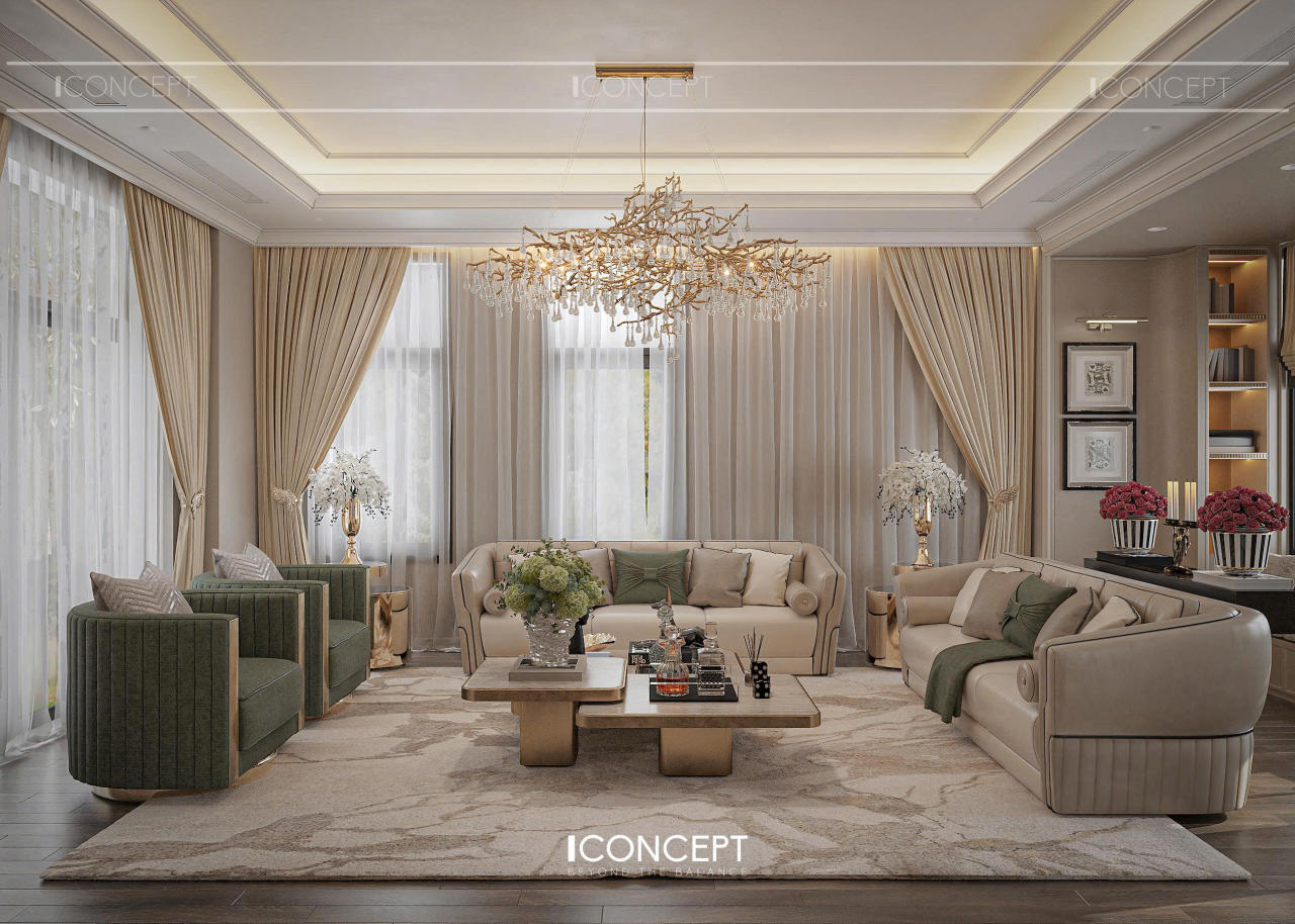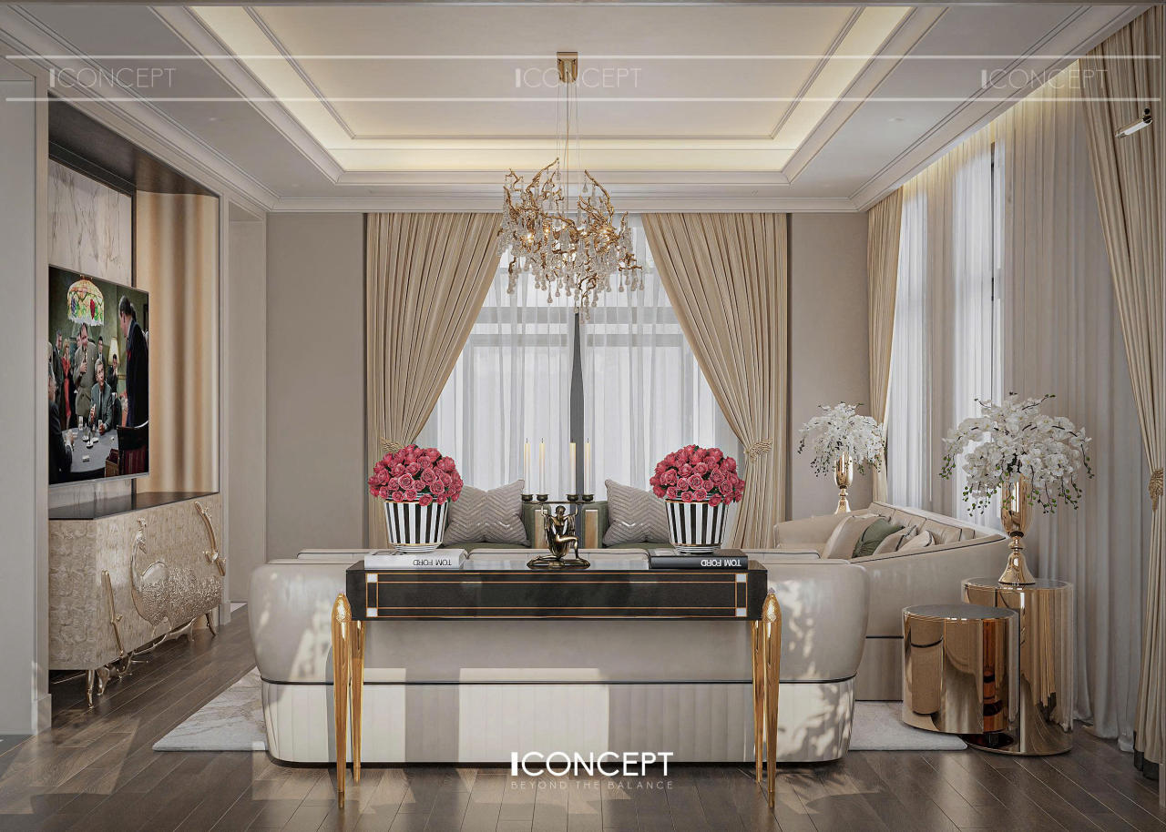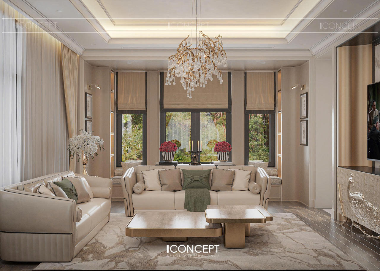 Phòng khách được ICONCEPT định hình như trung tâm cảm xúc của toàn bộ không gian sống, nơi giao thoa giữa thẩm mỹ, công năng và dấu ấn cá nhân của gia chủ. Phong cách Tân Cổ Điển đương đại được thể hiện thông qua bố cục mạch lạc, tỷ lệ cân đối và ngôn ngữ đường nét mềm mại.