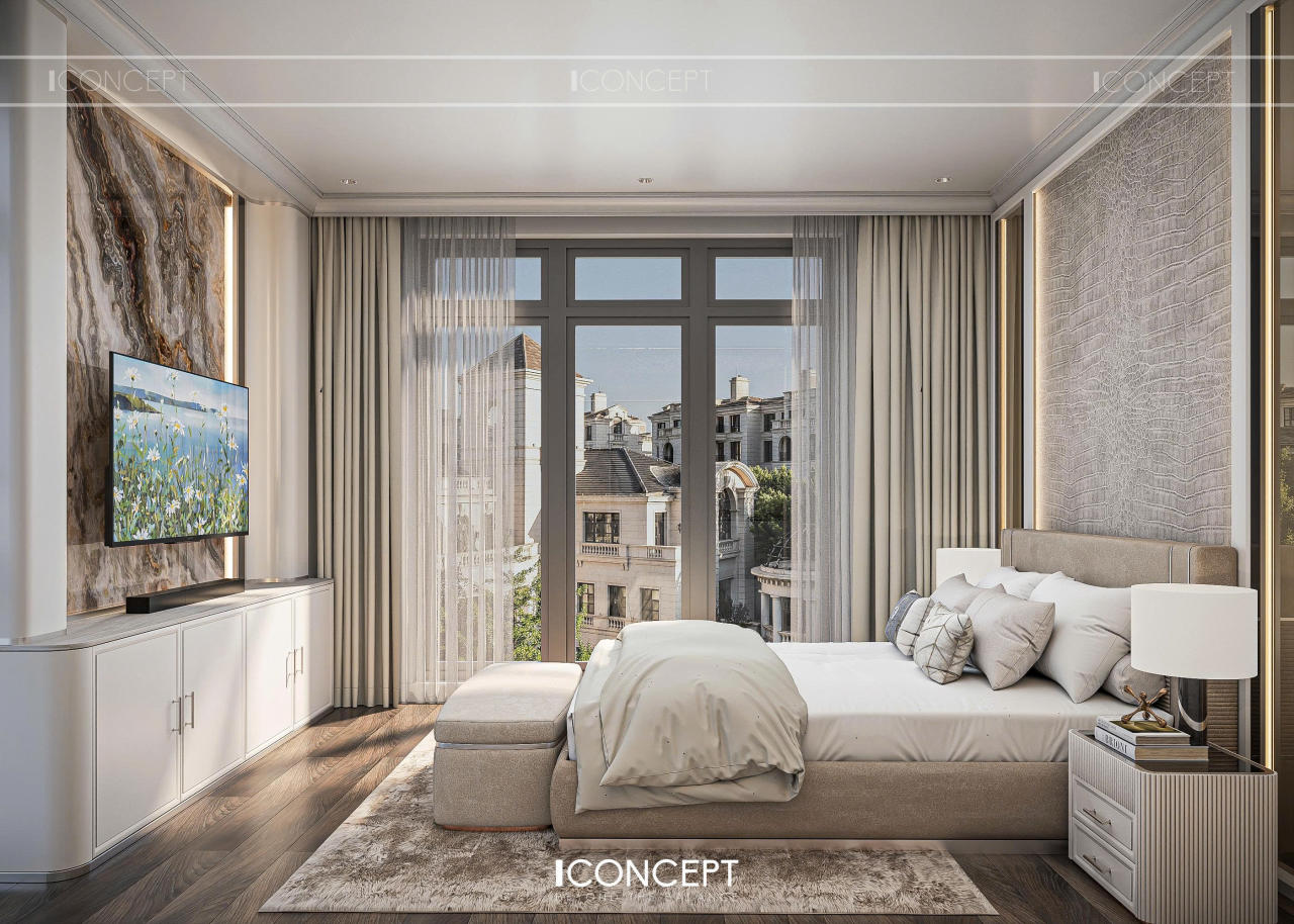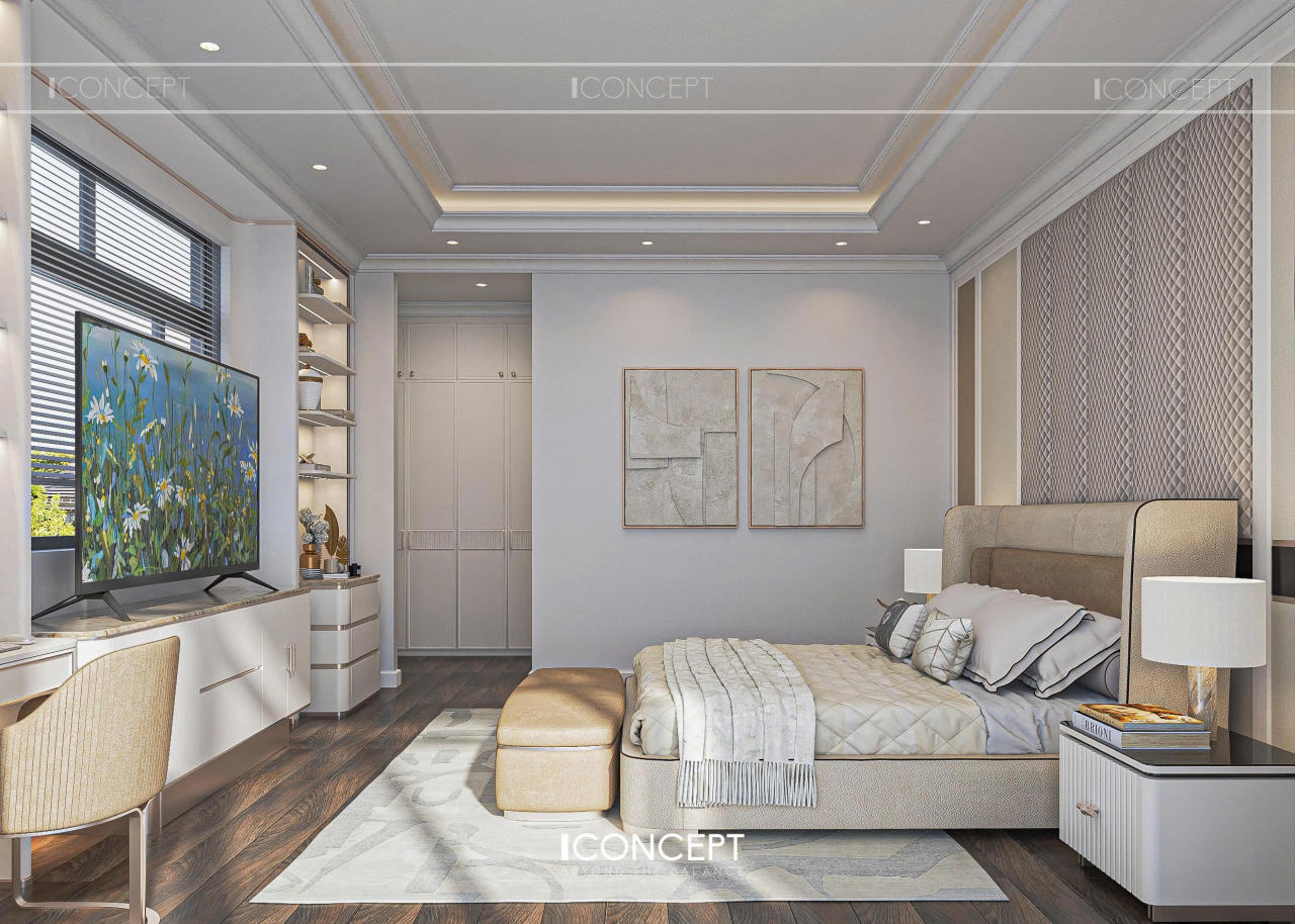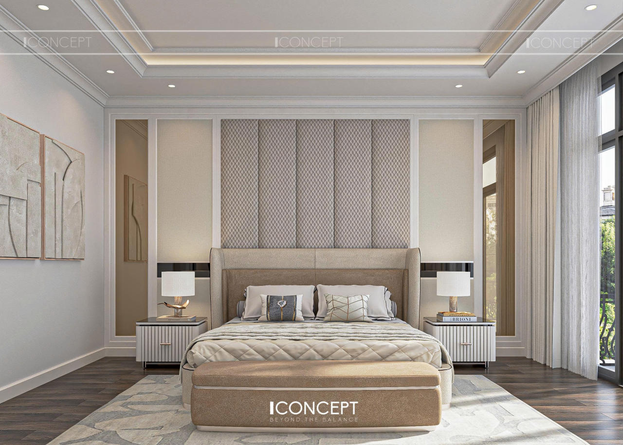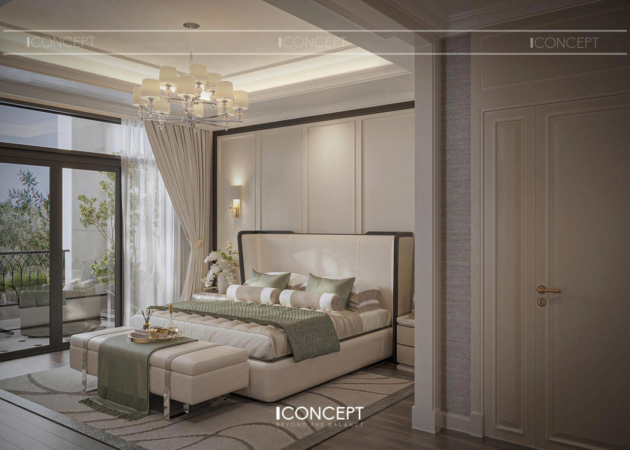 Phòng ngủ master được ICONCEPT định hình như khoảng lắng riêng tư, nơi gia chủ rút khỏi nhịp sống bên ngoài để trở về với sự thư giãn và tái tạo năng lượng. Thiết kế tiếp tục kế thừa tinh thần Tân Cổ Điển đương đại, nhưng được tiết chế mạnh mẽ để ưu tiên cảm giác nhẹ nhàng và an yên.