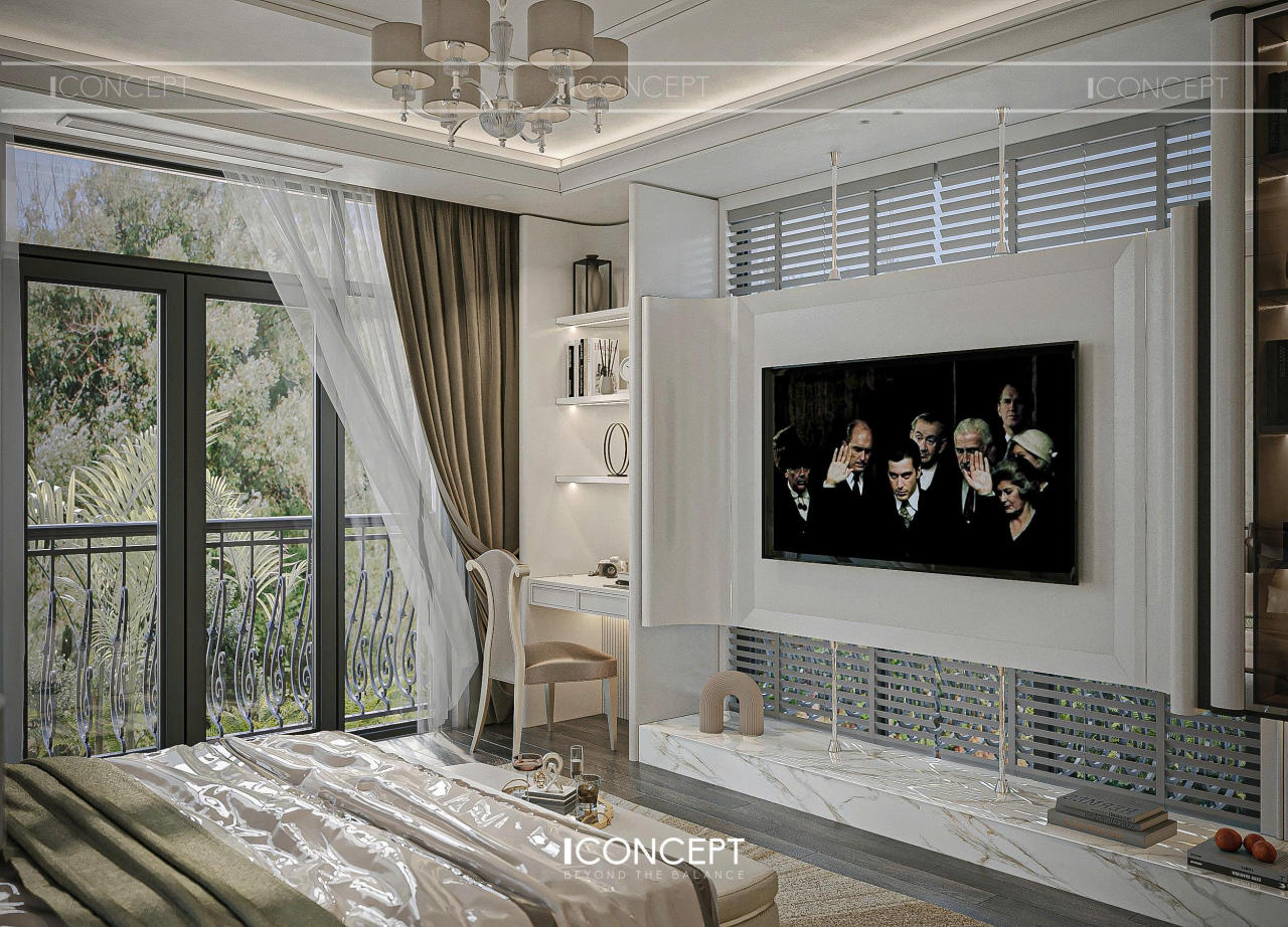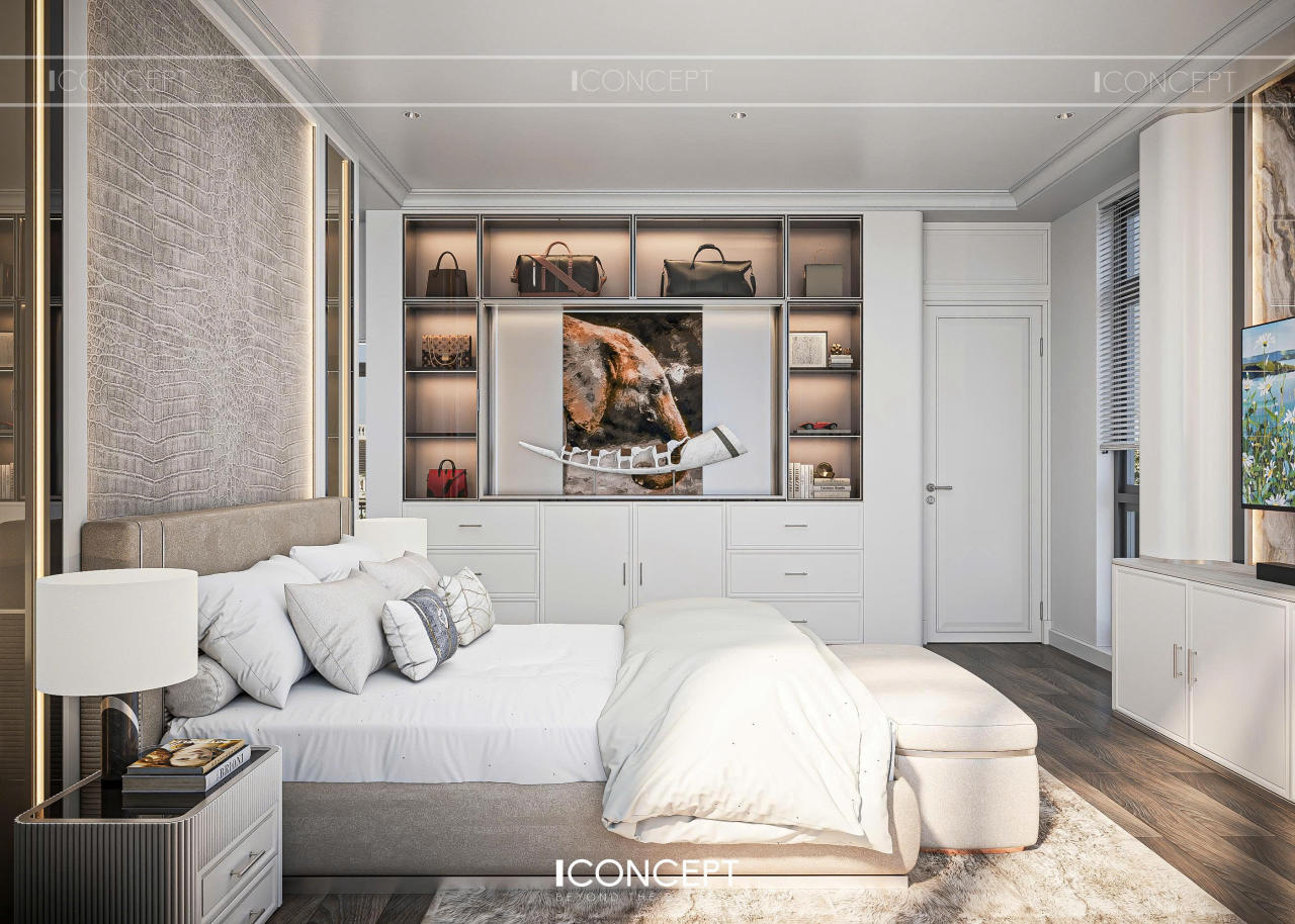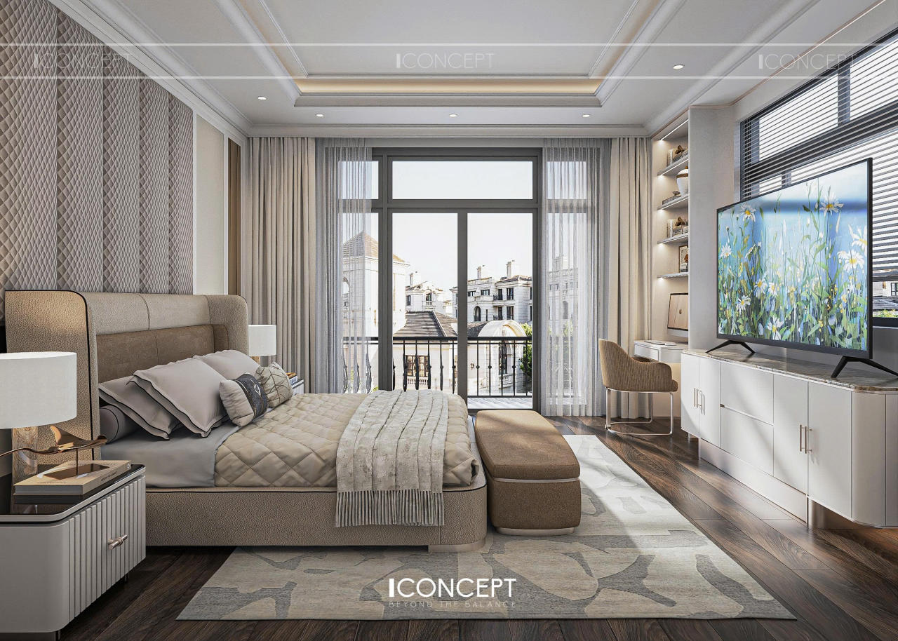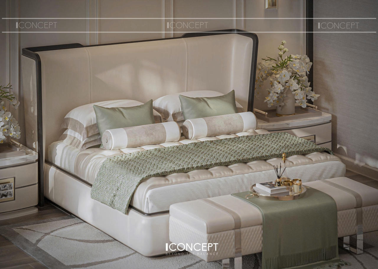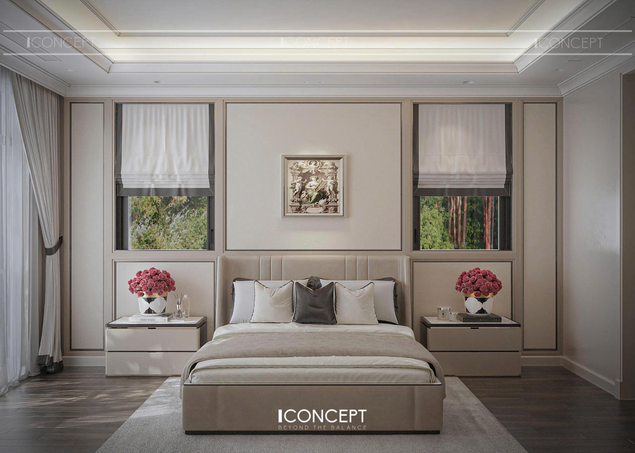 Phòng ngủ master được ICONCEPT định hình như khoảng lắng riêng tư, nơi gia chủ rút khỏi nhịp sống bên ngoài để trở về với sự thư giãn và tái tạo năng lượng. Thiết kế tiếp tục kế thừa tinh thần Tân Cổ Điển đương đại, nhưng được tiết chế mạnh mẽ để ưu tiên cảm giác nhẹ nhàng và an yên.