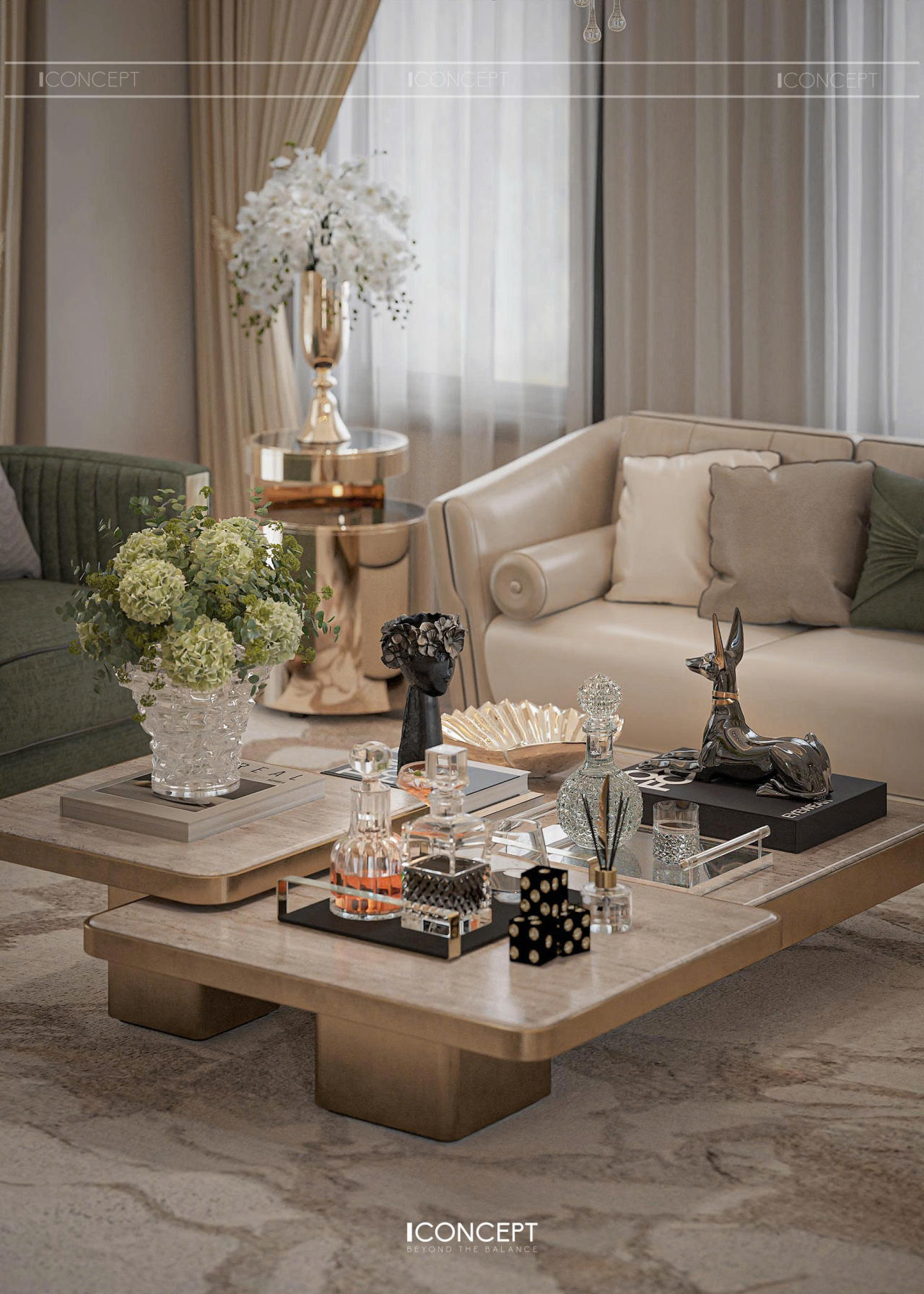 Vật liệu được lựa chọn kỹ lưỡng: đá marble vân nhẹ, kim loại ánh champagne, vải và da cao cấp… tất cả hòa quyện để tạo nên một không gian tiếp khách trang trọng nhưng vẫn gần gũi, ấm cúng – đúng tinh thần sống mà ICONCEPT theo đuổi.