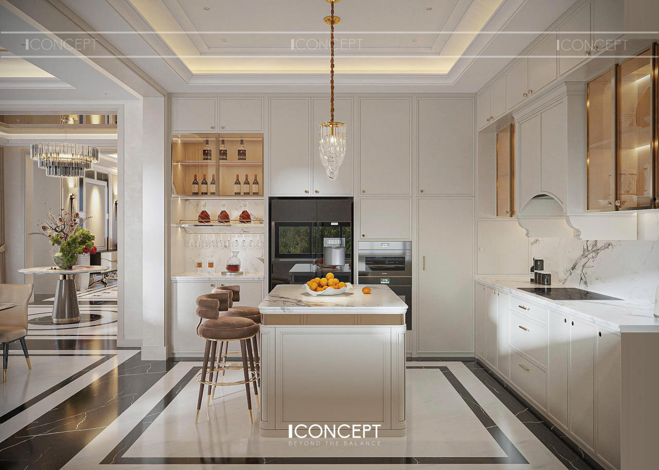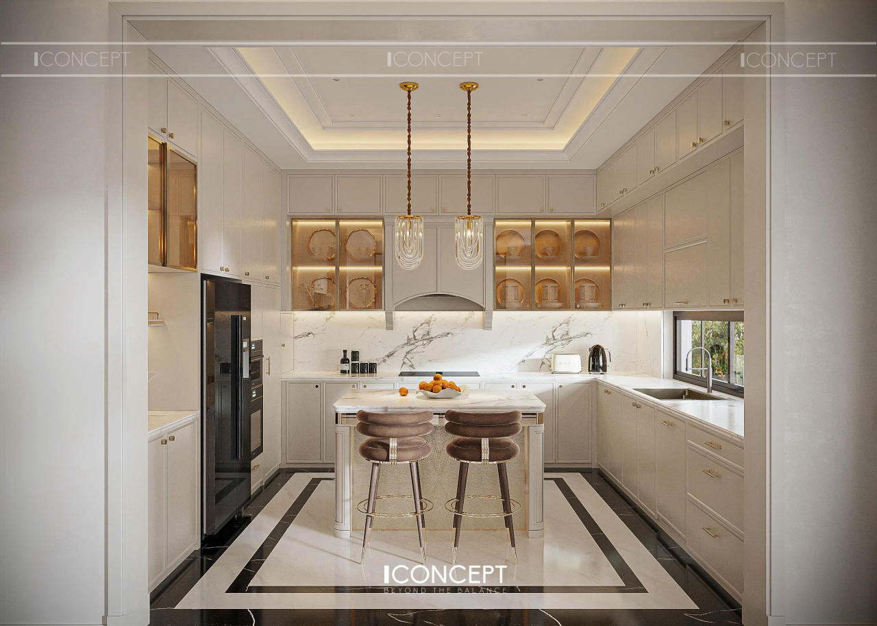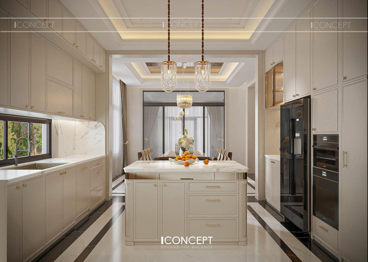 Không gian bếp nổi bật với hệ tủ bếp phong cách bán cổ điển, bề mặt panel phẳng kết hợp phào chỉ tinh giản. Tone màu trung tính được duy trì xuyên suốt, giúp khu bếp luôn sáng, sạch và dễ chịu. Hệ tay nắm kim loại mạ vàng nhẹ tạo điểm nhấn tinh tế, tránh cảm giác nặng nề hay phô trương.